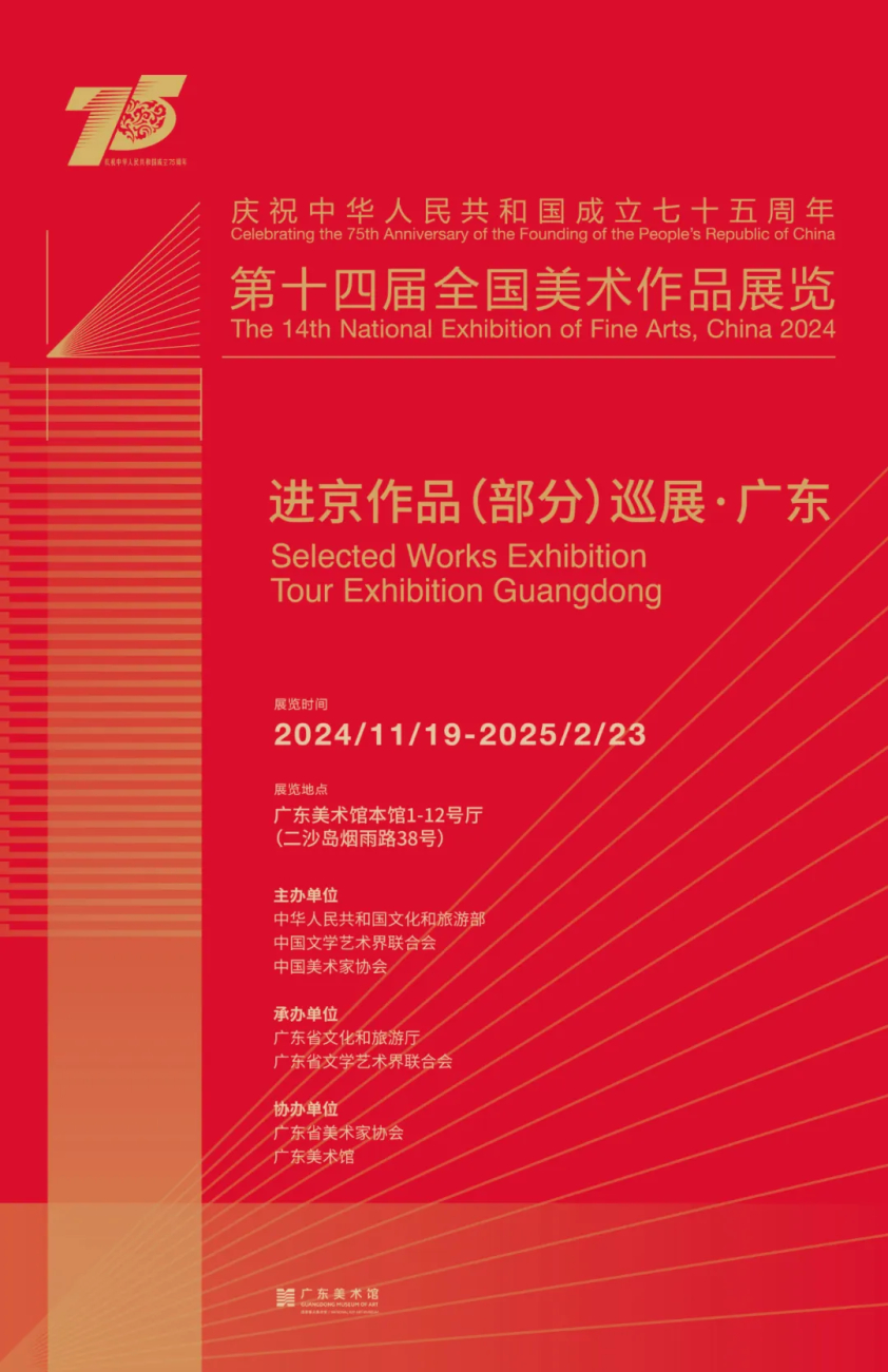 第十四届全国美术作品展览由中华人民共和国文化和旅游部、中国文学艺术界联合会、中国美术家协会共同主办,是庆祝中华人民共和国成立 75 周年重要文化活动之一,也是学习实践习近平文化思想系列活动之一。“第十四届全国美术作品展览进京作品(部分)巡展·广东”是第十四届全国美展巡展的第一站,展出作品共约375件,涵盖了中国画、油画、版画、雕塑等类型。内容丰富,具有突出的人民性、鲜明的时代性和多元的探索性。