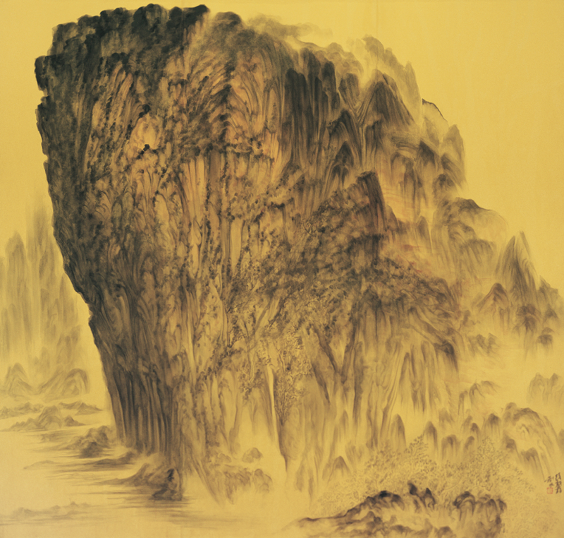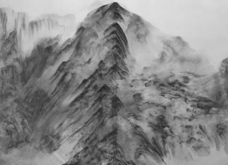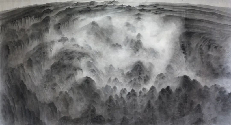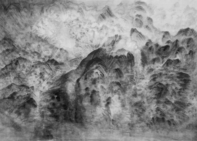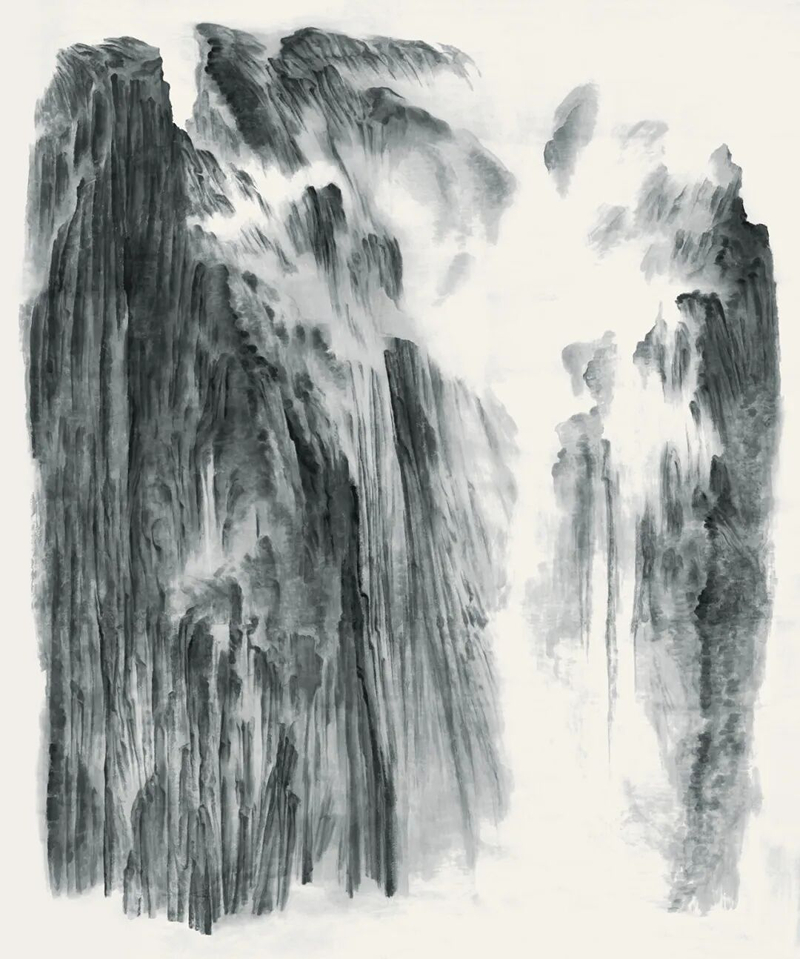Born in Shanghai in 1956, Xu Longsen has dedicated decades to the study of shanshui traditions, especially the brush-and-ink methods of the Five Dynasties and the Northern Song, as well as the works of masters such as Li Tang, Wang Meng, and the “Four Monks.” At the same time, Xu has long immersed himself in China’s mountains and rivers, repeatedly traveling to Mount Hua alone to absorb their forms and grandeur. This experience fostered an intuition-driven mode of creation. He paints in a state of “being with” the shanshui—what ancient critics called “mountains and valleys formed in the mind.” Xu emphasizes the “high distance.” His paintings rarely feature trees or human figures; instead, layers of ink washes and bold brushwork summon vast, primordial terrains that evoke the chaos of creation.